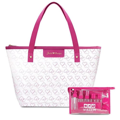 O Kit Bolsa + Frascos da Jacki Design é a escolha ideal para quem busca praticidade, organização e estilo em viagens, passeios ou no dia a dia. Com design moderno e funcional, o conjunto une a elegância da bolsa shopper transparente da coleção LOVE com a praticidade do kit de frascos em embalagem impermeável.