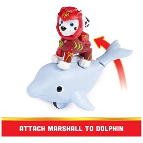 Entre em aventuras de resgate emocionantes com os seus filhotes favoritos e novos amigos aquáticos com o conjunto de bonecos de ação Patrulha Canina Aqua Pups O conjunto inclui Marshall, vestindo seu novo uniforme de neoprene, e um golfinho amigo. Prenda Marshall na barbatana das costas do golfinho e ative o movimento de cauda de golfinho rolando o para frente enquanto corre para resgatá lo e salvar o dia Com detalhes autênticos e verdadeiros, este conjunto traz toda a diversão subaquática do programa de TV de sucesso.