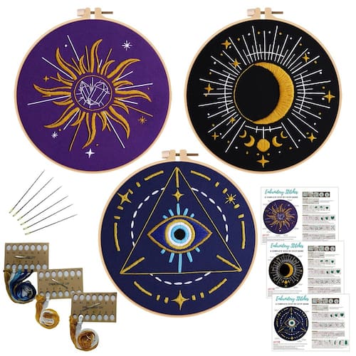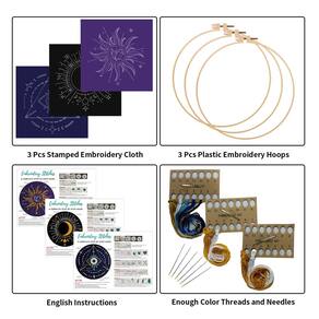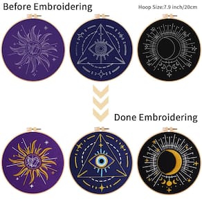 Características do kit de bordado Louise Maelys ampla variedade completa de kit inicial de bordado com todas as ferramentas que você precisa para bordar. Tecido de bordado requintado, de alta qualidade, com impressão clara, design de estilo pastoral fresco. Há um padrão colorido pré-impresso no tecido, o que fornecerá uma grande ajuda para começar. Fácil de lavar, tinta solúvel em água que é facilmente lavada quando você terminar de costurar seu design. As argolas de bordado têm um parafuso de ajuste de latão que é fácil de manter o tecido apertado. Perfeito para iniciantes que querem aproveitar a diversão do bordado. Ótimo presente para sua família, amigos e para a aula de bricolage das crianças. O bordado acabado é ótimo para decoração de casa, deixe seu quarto mais colorido. Conteúdo da embalagem: 1 argola de plástico para bordar. 1 peça de fios de cores diferentes. 1 peça de pano de bordado de algodão com padrão por design. 2 agulhas de bordado. 1 manual de instruções (idioma português não garantido). Como usar o aro de bordado 1. Separe a moldura interna e externa. 2. Coloque a moldura externa na mesa plana (moldura virada para baixo) 3. Cubra o pano bordado plano na moldura externa. (Bordado virado para baixo) 4. Pressione levemente a moldura interna na moldura externa com um pano bordado. (moldura interna virada para baixo) 5. Vire o pano bordado para sentir o aperto, ele pode ser utilizado para bordado em estado apertado. - Padrão de elemento de tarô: há padrão de olho turco de sol e lua no tecido de bordado, o que fornecerá grande ajuda para iniciantes em bordado. Três estilos diferentes de bordado de tarô permitirão que você experimente mais técnicas de bordado - Fácil operação: as instruções incluem ilustração de bordado, ensinando como lidar com fio de bordado, padrão impresso e a forma de emoldurar. Aviso: o padrão é feito de tinta especial, se a água desaparecer, não toque na água antes de terminar o bordado - Pacote econômico: este kit de ponto cruz para adultos inclui 3 tecidos de bordado com padrão, 3 argolas de plástico para bordado (tamanho da argola: 7,8 polegadas), 3 instruções em inglês, 6 agulhas de bordado e fios coloridos - Presente popular: este kit de bordado é perfeito para iniciantes, como um presente para seus amigos ou familiares para desfrutar do processo de bordado à mão. Será um presente significativo e especial - Ampla aplicação: Depois de terminar o bordado, você pode pendurá-lo ou colocá-lo na sala de estar ou no quarto. Ou bordar em fronhas, toalhas, lençol de cama, mochila, roupas é uma ótima escolha