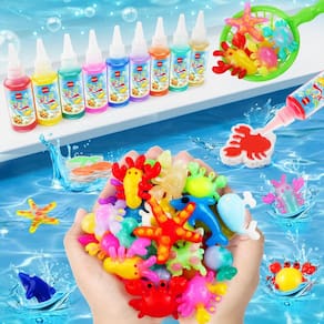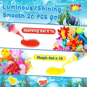 Magic Water Elf Toy Kit - Kit de fabricação macio: equipado com 24 formas de moldes, 70 ml de 10 cores de gel mágico puro, 9 cores de gel mágico brilhante, 1 gel que brilha no escuro, 8 pacotes de pó mágico, 24 ovos de dinossauro, um coador, um pote de aquário com luz, rede, copo medidor, luvas descartáveis, etiqueta de balança, instruções, acessórios ricos e completos, oferecendo infinitas combinações mágicas de elfos aquáticos para diversão criativa. - Brinquedo aquático Magic Elf: Esta atividade artesanal de elfo aquático é fácil e divertida, basta despejar o gel aquático no molde, esperar 30 segundos, colocá-lo na água com poder mágico, agitar lentamente o molde até que os animais de estimação mágicos de água de gel saiam do molde, após cerca de 30 minutos, espere que o gel endureça para fazer lindos brinquedos aquáticos coloridos. - Seguro e de alta qualidade: o kit de brinquedos de gel de água é feito de materiais não tóxicos e ecológicos, boa tenacidade, alta elasticidade, sem danos às mãos, adultos e crianças podem mergulhar com segurança na diversão das atividades de criaturas mágicas de água 3D DIY. - Criatividade e imaginação: o gel aquático mágico de água mole permite que seu filho crie suas próprias criaturas marinhas 3D, desenvolve a criatividade prática das crianças e sua imaginação enquanto brinca, este kit de apertar de água é educativo e divertido. - Kit de elfo aquático ótimos brinquedos para crianças: pode desviar a atenção das crianças de produtos eletrônicos para o kit de máquina de apertar e mantê-las ocupadas. O kit mágico de apertar de água é a escolha ideal para festas infantis, interações entre pais e filhos, festas de aniversário e também é um ótimo presente de aniversário.