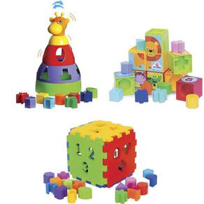 Kit de brinquedos para bebê girafa + cubo + cubinhosKit de brinquedos para bebê girafa + cubo + cubinhosContém:1 girafa didática1 cubo didático pequeno1 cubinho 5 em 1 Girafa didáticaGirafa didática para empilhar, encaixar e brincarAcompanha 10 peças com formas geométricas para encaixar e aros para empilhar.Incentiva a percepção, o raciocínio lógico, a coordenação motora e auxilia a distinguir formas e cores. Cubo didático pequenoDivertido e colorido cubo didático.Desmonte o cubo e monte um lindo tapete e comece a brincar com as 18 peças para encaixar.Acompanha números e peças com formas geométricas para encaixar.São 18 peças de encaixeVira um tapeteFácil de montar e desmontar Brinquedo educativo cubinhos 5 em 1Brincando de empilhar, aprendendo encaixar formas e montar quebra-cabeças. Incentiva a distinção de cores, raciocínio lógico, coordenação motora e o equilíbrio. 1 - aprendendo a empilhar2 - 3 mini quebra-cabeças3 - aprendendo os números4 - aprendendo figuras diversas5 - 9 formas geométricas para encaixar Marca: mercotoysDimensões: 28 x 7 x 22Categoria: brinquedos educativos / bebêsFaixa etária: +18 meses Aprovado pelo inmetro:001 571/2019 - OCP0098
