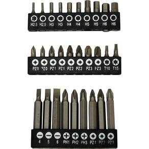 - 50 bits para parafusar 25 mm: 12 pcs fenda: 3 mm*2; 4 mm*2; 5 mm*2; 6 mm*2; 6.5 mm*2; 7 mm*2 / 8 pcs Torx: T10 T15 T20 T25 T27 T30 T35 T40;