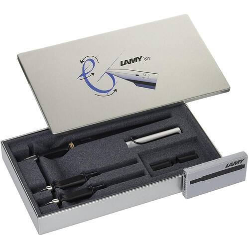 O conjunto é composto de: 1 - Caneta tinteiro Lamy Joy Al Preta; 1 - Tampa de alumínio com haste preta flexível; 1 - Uma caixa de metal; 5 - Cartuchos de tinta preta LamY T10 ; 3 - Pontas intercambiáveis larguras 1,1mm, 1,5mm e 1,9mm;