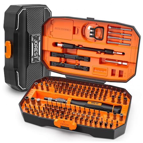 Kit de chaves de fenda de precisão JOREST com 152 peças, incluindo 140 bits H4x28 mm e 4 bits longos H4x48 mm em formatos Torx, Phillips, pentalobe, star, triwing e triangle, para reparos em eletrônicos, laptops, consoles e acessórios. Inclui extensão ajustável, eixo flexível, magnetizador/demagnetizador, tapete magnético e adaptador 1/4" para 4 mm, facilitando desmontagens em ângulos variados e locais profundos. Caixa organizada com slots magnéticos mantém bits identificados por modelo.