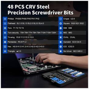 Kit de chaves de fenda de precisão compacto para reparos em eletrônicos, incluindo computadores, laptops, MacBooks, tablets, celulares, consoles PS5, XBOX, Switch, óculos, drones, relógios e campainhas Ring Doorbell. Possui 48 bits em formatos Phillips, flathead, Torx, Torx security, triwing, Pentalobe, hex, triangle, U-type, square, SIM, MID, oval, Gamebit e nut driver, adequado para manutenção técnica de dispositivos IT. O conjunto armazena acessórios em estojo plástico para organização e portabilidade.