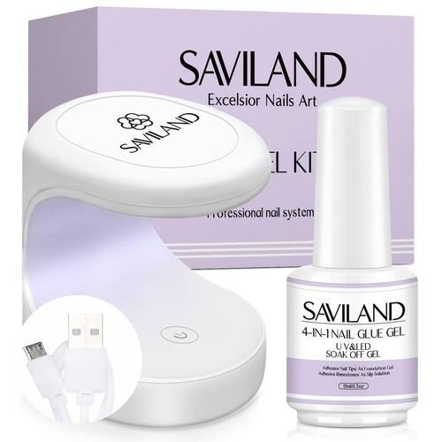 - KIT DE GEL SAVILAND NAIL GLUE: contém 15 ml de cola de gel* 1, lâmpada mini U V/LED* 1 (NÃO RECARREGÁVEL). Este kit de unhas de gel é adequado para você fazer suas unhas extensoras de forma rápida e duradoura em casa ou no salão de beleza, perfeitamente apropriado para alguns iniciantes ou amadores. Você pode facilmente estender suas unhas e se divertir com o bricolage de unhas
