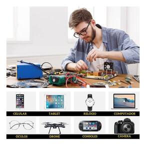 Kit com diversas chaves e acessórios para reparo de eletrônicos.Tipo