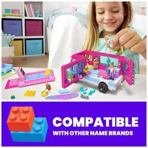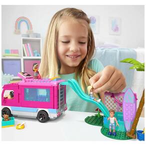 O Buildable Barbie Dream Camper inclui uma cama na cobertura, TV, detalhes internos com uma cozinha completa 580 tijolos incluem 4 micro bonecas Barbie montáveis, 1 filhote de estimação, acessórios de moda e comida O brinquedo de construção vem com uma piscina com escorregador destacável, sofá, fogueira, prancha de surf e muito mais As peças combinam com todos os brinquedos dos edifícios MEGA e Barbie e são compatíveis com outras marcas de nomes Ideal para idades de 6 , esses brinquedos de construção ajudam a desenvolver habilidades de criatividade e solução de problemas