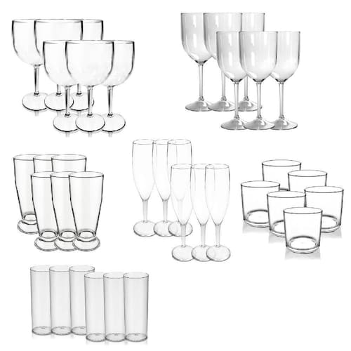 Kit De Copos E Taças Transparentes Krystalon Acrílico O Jogo completo de Copos e Taças Acrílicos PS KrystalON te oferece resistencia e durabilidade, com produtos de ótima qualidade, que podem ser para festas, bares ou eventos, sempre te deixando em grande estilo. O jogo contém: 6 Taças Champagne, 6 Taças de Vinho, 6 Taças Gin, 6 Copos Tulipas de Chopp, 6 Copos Long drink TBPS e 6 Copos On The Rocks. Especificações: Material: Poliestireno Acrílico PS , Altura: Champagne: 22 cm, Vinho: 20,7 cm, Gin: 20 cm, Tulipa: 16,5 cm, Long Drink: 15 cm, On The Rocks: 8,2 cm Diâmetro: Champagne: 5 cm, Vinho: 8,5 cm, Gin: 10 cm, Tulipa: 6,6 cm, Long Drink: 6 cm, On the Rocks: 8,1 cm, Capacidade: Champagne: 170 ml, Vinho: 400 ml, Gin: 550 ml, Tulipa: 330 ml, Long Drink: 300 ml, On the Rocks: 320 ml, Cor: Transparente, Tamanho: Unico, Quantidade: 36 peças 6 peças de cada modelo