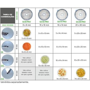 Otimize a produtividade da sua cozinha com o Kit Cubo Grande 14 mm (KC14), desenvolvido para proporcionar cortes precisos e uniformes em grandes volumes. Ideal para cozinhas profissionais, o conjunto conta com a grade GC14 PRO (14 x 14 mm) e o disco de corte E14 (14 mm), garantindo cubos perfeitos para diversas preparações.