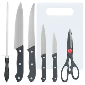 - Kit composto por: 1 Tesoura Culinária; 1 Tábua de Corte; 1 Chaira; 1 Faca do Chefe; 1 Faca para Carne; 1 Faca Universal; 1 Faca para Descarcar