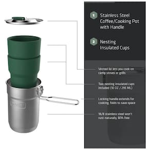 ACESSÓRIOS IDEAL PARA EXTERIORES O kit de cozinha Stanley é perfeito para cozinhar ao ar livre para refeições quentes, café ou água fervente. Nossas panelas vêm com uma parte superior ventilada para deixar o vapor escapar ou filtrar o líquido. Este é um ótimo presente de suprimentos de sobrevivência também PUNHO VERSÁTIL Projetamos o cabo para fornecer o máximo de conforto e estabilidade enquanto está no fogão. O cabo de travamento se estende para um cozimento estável, mas se dobra sobre a tampa para economizar espaço com o resto do seu equipamento DURÁVEL E SEM BPA A chaleira , cafeteira é construída com aço inoxidável 18, 8 e possui dois copos isolados portáteis de 10 onças , 295 ml para desfrutar de bebidas quentes e frias. Todo o kit é feito com materiais sem BPA Marca: Não Informado