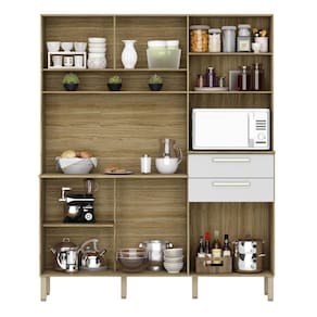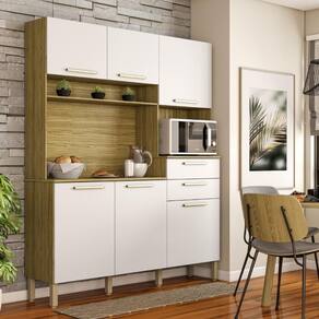 A Cozinha é produzida com madeira reconstituída - MDP de 12 mm e MDP de 15 mm nos tampos, provindo de reservas florestais para este fim, respeitando o meio ambiente. Possui seis portas, duas amplas gavetas - nas portas e gavetas são utilizados dobradiças e corrediças 100% metálicas. Os puxadores são em plástico resistente (poliestireno) com acabamento metalizado, que proporciona grande durabilidade. Seis pés reguláveis em plástico resistente (polipropileno) garantem a estabilidade do produto, podendo-se fazer pequenes ajustes na montagem, para o produto se adequar mesmo em pisos com pequenas irregularidades. Conta com nicho para pequenos objetos, além disso, tem nicho para micro-ondas e passa-fio no traseiro facilitando o acesso à tomada na parede. O espaço interno é bem dividido com a utilização de prateleiras, para melhor organizar os utensílios da cozinha. O acabamento é com pintura UV, deixando o móvel mais bonito com padrões de cor que trazem modernidade e beleza a sua cozinha.