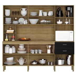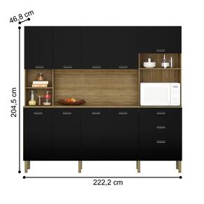 Com altura de 204,5 cm, largura de 222,2 cm e profundidade de 46,8 cm garantem que a cozinha Intense seja uma das maiores do mercado de Kits e cozinhas práticas. E o melhor: a instalação e a montagem são rápidas e fáceis, sem precisar furar a parede para fixação, o que faz toda a diferença para para você. Além disso, a cozinha prática Intense conta com 3 nichos decorativos que permitem personalizar a decoração da cozinha e guardar itens do dia a dia, deixando o ambiente ainda mais bonito e funcional. E não podemos esquecer do nicho para forno elétrico ou micro-ondas, com um espaço amplo para garantir a praticidade na hora de cozinhar e utilizar no dia a dia. Mas não é só isso. As duas amplas gavetas com corrediças telescópicas são um verdadeiro show à parte, proporcionando um deslize suave e sem esforço, sem contar que são super espaçosas e garantem a organização dos utensílios da pés com regulagem, os puxadores em ABS com pintura inox e as portas em 15 mm de espessura garantem resistência e durabilidade, além de um design moderno e sofisticado.