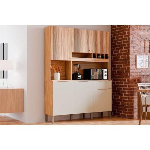 Tipo de Dobradiças - Dobradiças Metálicas Tipo de puxador - ABS/PVC Quantidade de Portas - 6 Portas de Abrir Tipo de Gaveta - Gaveta Externa Quantidade de Gavetas - 1 Tipo de Corrediça - Telescópicas Material das Prateleiras - Prateleiras em MDF Quantidade de Prateleiras - 3 Prateleiras Quantidade de nichos - 7 nichos Diferenciais dos Nichos - Nicho Garrafeiro - Nicho p/ Microondas - Nicho Decorativo Quantidade Porta-Garrafa - 1 Porta-Garrafa