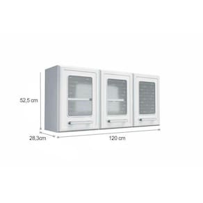 Dimensões(Cm): Comprimento(Profundidade): 28,3cm x Largura: 120cm x Altura: 52,5cm Tipo de Estrutura do Móvel - 100% aço Tipo de Pintura - Eletrostática a Pó Tipo de Acabamento da Pintura - Alto Brilho Características de móveis - Armário Aéreo - Armário Triplo Tipo de puxador - c/ Proteção UV Quantidade de Prateleiras - 1 Prateleira Quantidade de Portas - 3 Portas de Abrir Garantia - 3 meses Certificação de Qualidade de Móveis - Qualidade Aprovada Cor Principal - Branco