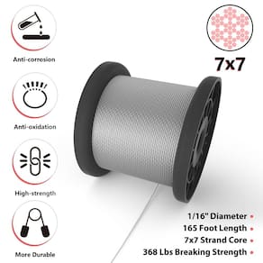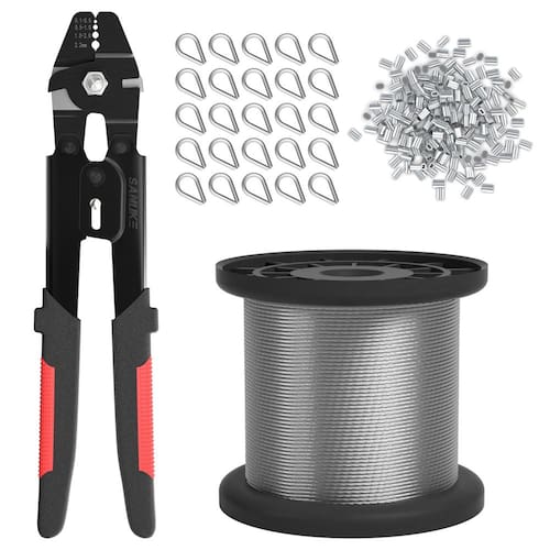 Sanuke Kit de crimpagem de corda de fio com cabo de aço inoxidável 304 de 50 m, 1/16, núcleo de fio de 7 x 7, 100 peças de mangas de crimpagem de alumínio de 1/40.6 cm e 25 peças de dedal de aço inoxidável M2 - Aplicações versáteis – o kit de ferramentas de crimpagem de corda de aço é amplamente utilizado para decoração de casa e qualquer trabalho manual que exija cabos fortes, como varais, lâmpadas suspensas de jardim, guarda-sol ao ar livre, grades caseiras, equipamentos marítimos e industriais, aventuras ao ar livre, etc - O pacote inclui: você receberá o kit de ferramentas de crimpagem de corda de aço com 1 alicate de crimpagem resistente, 1 rolo de cabo de aço inoxidável de 50 metros 1/16, 100 peças de mangas de alumínio e 25 peças de dedais de aço inoxidável. Não é necessário comprar acessórios adicionais - Ferramenta de crimpagem: o crimpador é feito de aço inoxidável resistente para resistência à corrosão e durabilidade com 2 cortadores e 4 posições de crimpagem de 0,1 a 0,5 mm, 0,5 a 1,0 mm, 1,0 a 2,0 mm e 2,2 mm, equipado com uma alça antiderrapante e mecanismo de travamento automático para corte e crimpagem fáceis e precisos de cabos - Cabo de aço inoxidável 304 – corda de fio 1/16 feita de aço inoxidável 304 em uma construção de 7 x 7 fios com 49 fios firmemente trançados. Resistência à ruptura de até 166 kg, mais forte do que 16 x 19 e 6 x 36. O tamanho de 50 metros permite que você corte em qualquer comprimento que você precisar - Mangas e dedões de alumínio – 100 peças de mangas de crimpagem feitas de alumínio e o tamanho das mangas é de 1,5 mm (1/40.6 cm) para proteger o olho do cabo de aço ou da linga. 25 peças de dedais feitos de aço inoxidável, tamanho M2