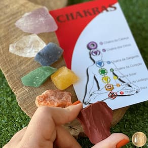 Kit de Cristais Bruto - 7 Chakras, contém 7 pedras naturais brutas com aproximadamente 2 a 3cm, acompanha card explicativo sobre as propriedades terapêuticas e energéticas das pedras.