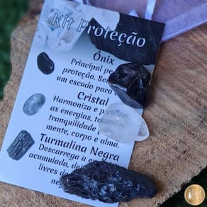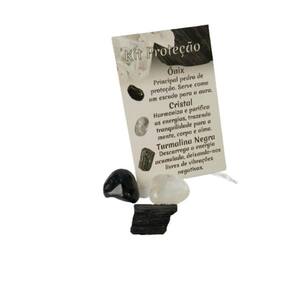 Kit de Cristais de Proteção, contém 2 pedras naturais roladas e 1 pedra natural bruto com aproximadamente de 1 a 2cm, acompanha card explicativo sobre as propriedades terapêuticas e energéticas das pedras e saquinho de organza para guardá-las.