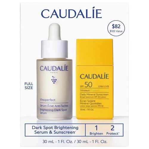Uma dupla iluminadora com um soro iluminador Vinoperfect em tamanho real e protetor solar mineral diário SPF 50 para combater visivelmente as manchas escuras e até mesmo o tom da pele. Formulados com viniferina clareadora, esses dois produtos trabalham juntos para proteger a pele e combater as manchas escuras que podem aparecer como resultado da exposição ao sol. Para um bronzeado perfeito e brilhante, aplique o Sérum Vinoperfect antes do protetor solar se você estiver saindo ao sol.