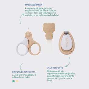 Kit de Cuidados & Higiene Bebê 3 Peças Nude Petit Piá O Kit de Cuidados & Higiene Bebê da Petit Piá, na cor nude, é ideal para atender às necessidades diárias de cuidados com seu bebê, combinando funcionalidade e elegância em um único conjunto. Com três peças essenciais, este kit é a escolha perfeita para manter a higiene e o conforto do seu pequeno. Segurança: A segurança é garantida com materiais livres de BPA e ftalatos, assegurando que cada item do kit seja seguro para o contato com a pele sensível do bebê. A tesoura possui pontas arredondadas para evitar acidentes, enquanto a lixa e o cortador são projetados para evitar cortes ou machucados.Conforto: Cada peça do kit é ergonomicamente projetada para facilitar o uso tanto para os pais quanto para o bebê. A tesoura é leve e fácil de manusear, a lixa tem uma superfície suave para uma utilização confortável, e o cortador possui um design intuitivo que torna o cuidado das unhas simples e eficiente.Durabilidade: Feito com materiais de alta qualidade, o kit é resistente e durável. A tesoura, a lixa e o cortador mantêm sua eficácia e aparência mesmo após uso contínuo, oferecendo um produto de longa duração.Facilidade no Uso: O Kit de Cuidados & Higiene Bebê é fácil de usar e ideal para a rotina diária. A tesoura e o cortador são projetados para proporcionar um corte preciso e seguro, enquanto a lixa é perfeita para suavizar as bordas das unhas, evitando que fiquem ásperas ou afiadas.Benefícios para a Criança: Manter as unhas do bebê bem cuidadas é essencial para evitar arranhões e desconforto. A tesoura, a lixa e o cortador permitem um cuidado eficaz e seguro, promovendo a higiene e o conforto do bebê.Desenvolvimento e Bem-Estar: Um cuidado adequado com as unhas contribui para o bem-estar do bebê, ajudando a evitar desconfortos e possíveis irritações.