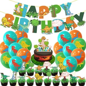 Conjunto completo de festa de dinossauros: inclui um banner de “Feliz Aniversário”, uma cobertura de bolo com lindas figuras de dinossauros e 18 balões de látex em verde vibrante, laranja e azul. Design divertido de dinossauro: o banner e a cobertura do bolo apresentam ilustrações divertidas de dinossauros, incluindo T-Rex e Triceratops, adicionando um tema divertido à festa de aniversário do seu filho. Perfeito para festas masculinas: projetado para amantes de dinossauros, este conjunto de decoração é ideal para aniversários de meninos, proporcionando uma atmosfera empolgante para qualquer celebração. Materiais de alta qualidade: feitos com látex durável e papel ecológico, garantindo uma decoração segura e duradoura para seu evento. Configuração fácil: o banner é fácil de pendurar e os balões são simples de inflar, tornando rápido e conveniente configurar a decoração da sua festa.