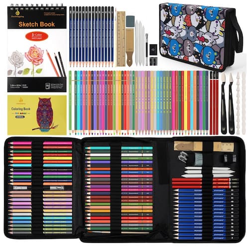 Este kit de desenho Daerthotk com 100 peças reúne lápis grafite, lápis de cor a óleo, lápis aquareláveis, lápis metálicos e carvão, além de sketchbook em três cores, livro para colorir e acessórios em um estojo portátil. O conjunto foi desenvolvido para atividades de esboço, sombreamento, mistura de cores e coloração em nível iniciante e intermediário.