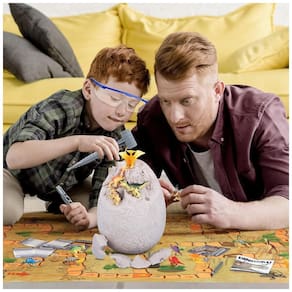Com o Jumbo Dino Egg, as crianças podem se divertir enquanto aprendem sobre dinossauros Este brinquedo educacional inclui um enorme ovo de dinossauro, 12 cartões coloridos com informações sobre cada um dos 12 dinossauros exclusivos que podem ser encontrados, 6 ferramentas de escavação, óculos de segurança, um livro de estrutura de dinossauro e um tapete lavável. Além disso, o kit vem com um dado e um martelo que aumenta a experiência de escavação.
