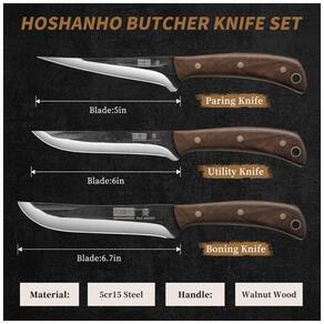 Este versátil e funcional conjunto de facas para açougueiro inclui uma faca de desossar de 6,7 polegadas, uma faca de dividir de 6 polegadas e uma faca de cortar legumes de 5 polegadas. Estas facas afiadas serão uma adição indispensável para qualquer cozinha! Encare desafios culinários como fatiar, picar, cortar bifes, legumes e frutas, sendo adequadas para churrascos, trilhas e acampamentos. Cada faca para cortar carne é feita de aço inoxidável de alto carbono premium, com dureza de 58 Rockwell, garantindo resistência e nitidez excepcionais. O cabo de madeira de nogueira durável é antiderrapante e equilibrado, garantindo estabilidade e conforto durante o uso. Com lâmina super afiada afiada a 16 graus por lado, estas facas oferecem desempenho de corte máximo e durabilidade, sendo ideais tanto para cozinheiros domésticos quanto para chefs profissionais. O conjunto de facas de açougueiro japonês vem em uma bela caixa de presente, sendo perfeito para presentear em diferentes ocasiões como Dia das Mães, Dia dos Pais, Natal, entre outros.