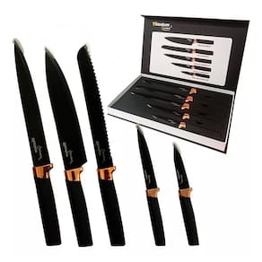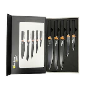 Tudo o que você procura em um só lugar A mais de 20 anos no mercado, proporcionando as melhores experiências Kit de Facas Premium Aço Inoxidável Titanium Gourmet com 5 Peças Benefícios: Se você busca por facas com bom desempenho, qualidade e elegância o Kit de facas Premium da Titanium Gourmet é a escolha certa. Pode ser utilizado em cozinhas domesticas ou profissionais. Descrição: O jogo de facas premium feita com lâmina em aço inoxidável, revestimento escuro de carbono. Faca do Chef: É utilizada para cortar filés de carne antes do preparo; fatiar carnes já assadas, fatiar peças de embutidos, como salames e queijos; picar temperos e afins. Faca Fatiadora: Utilizada para cortar files ou removes peles de peixes ou carnes. Faca para Frutas: É utilizada para picar, cortar e filetar legumes, verduras cruas ou cozidas e frutas. Faca Utilitária: Para todos os tipos de corte, mas é utilizada principalmente para fatiar e picar legumes e carnes. Faca para Pão: É utilizada para cortes de pães e massas similares. Ideal para alimentos com crosta pois não amassa. Ideal Para Tomates, Pessegos, pães e tortas recheadas. Ficha Técnica: Cabo: Plástico Lâmina: Aço Inoxidável Dimensão da Lâmina Faca de Chef: 20,3 cm Faca Fatiadora: 20,3 cm Faca para Frutas: 8,9 cm Faca para Pão: 20,3 cm Faca Utilitária: 12,7cm Todos os nossos produtos são e emitimos . Esse produto acompanha: 01 Faca de Chef 01 Faca Fatiadora 01 Faca para Pão 01 Faca Utilitária 01 Faca para Frutas Marca: Titanium Modelo: 6896 : 12 Meses Ean: 7908200009157 Será um prazer lhe atender, estamos esperando o seu pedido. Imagens meramente ilustrativas. Marca: Não Informado