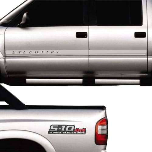 1 Jogo de Faixas Laterais Executive Fabricado em Poliéster Escovado Dimensões: 195 X 7,2CM2 Adesivos Laterais S-10 4X4 Turbo Electronic Vermelho Fabricado em Poliéster Escovado Dimensões: 44,1 x 11 cm1 Faixa Traseira Chevrolet Fabricado em Vinil Transparente /Dimensões:108 x 6,1 cm
