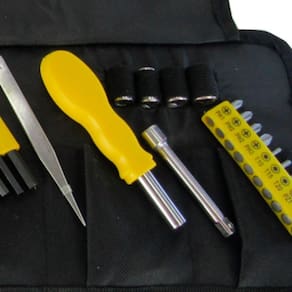 Kit de Ferramentas 32 Peças 5490 - Titanium - Jogo de ferramentas com 32 peças é ideal para diversas aplicações diárias, além de ser extremamente útil para trabalhos profissionais ou hobby, seja na oficina, ou na própria residência. Composto por ferramentas robustas e com alta qualidade, sendo fabricadas em aço especial, garantindo maior vida útil e resistência. Características Gerais do Produto: Peso Gr : 2300g Dimensões: 5 X 22 X 32 Acompanha o produto: 1 Estojo 4 Soquetes 1 Extensor 8 Chaves Allen 1 Pinça 1 Chave encaixe sextavado 1/4 1 Mini alicate bico longo 6 Chaves de precisão 10 Bits : 3 meses Marca: Não Informado