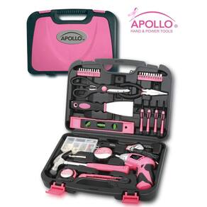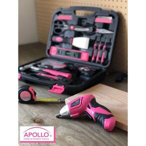 Kit de ferramentas domésticas Apollo de 135 peças rosa com chave de fenda giratória sem fio de íon de lítio de ângulo duplo de 3,6 V - DT0773N1 - Kit de ferramentas domésticas de bricolage. Este conjunto inclui ferramentas cuidadosamente escolhidas para tarefas domésticas diárias e de bricolage. Além da poderosa chave de fenda sem fio, ferramentas úteis incluem martelo, chave ajustável, alicate de ponta longa, nivelador, fita métrica, tesoura, faca utilitária, chaves de fenda de precisão, espátula e sortimento de 100 peças para pendurar na parede, fita isolante e brocas de chave de fenda e muito mais
