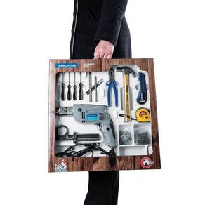 Kit De Ferramentas Com Furadeira 500W 127V 100 Peças Tramontina Descrição: O Kit de Ferramentas Tramontina com Furadeira Elétrica 500 W 127 V 100 peças é o conjunto ideal para ajudar em pequenos reparos domésticos. É indicado tanto para instalar quadros ou outros acessórios na parede, quanto para cortar fios e apertar parafusos. As ferramentas são produzidas e testadas com rigorosos padrões de qualidade. Contém: 1 Alicate Universal 7 1 Broca para Concreto 10x150mm DIN 8039 1 Broca para Concreto 3x75mm 1/8 1 Broca para Concreto 4x75mm 5/32 DIN 8039 1 Broca para Concreto 5x85mm 3/16 DIN 8039 1 Broca para Concreto 6x100mm DIN 8039 1 Broca para Concreto 8x120mm 5/16 DIN 8039 30 Buchas em Nylon S-6 1 Chave de Fenda Ponta Chata 1/8x3 1 Chave de Fenda Ponta Chata 3/16x3 1 Chave de Fenda Ponta Cruzada 1/8x3 1 Chave de Fenda Ponta Cruzada 3/16x3 1 Estilete Retrátil 6 1 Furadeira de Impacto 1/2 127V 500W 1 Martelo de Unha 18mm 30 Parafusos para Madeira 4,2x50 25 Pregos com Cabeça 13x18mm 1 Trena Métrica 3m Importante: Composição variada que oferece versatilidade na utilização do dia-a-dia. As ferramentas são produzidas e testadas conforme normas específicas. use óculos, luvas e outros equipamentos de proteção individual EPIs de acordo com a tarefa a ser executada. Mantenha ferramentas de corte longe do alcance de crianças. Mantenha as ferramentas sempre limpas para um melhor agarre, pois usá-las sujas com graxa ou óleo pode causar acidentes. Armazene em local limpo e seco. Respeite sua cidade e o meio ambiente, para descarte dos produtos e embalagens, siga as orientações de reciclagem vigentes. Peso Bruto: 3,4000 kg. Dimensões Embalagem Compr. X Larg. X Alt. : 505x 490x 80 mm. Ean: 7891114122169