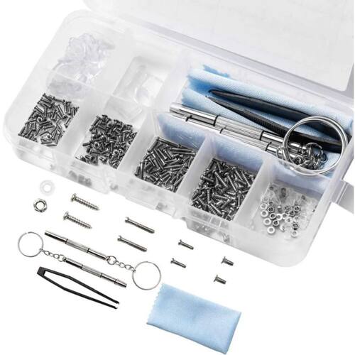 O kit de ferramentas para manutenção e reparo de óculos inclui duas mini chaves de fenda\ NVem com diferentes comprimentos e tamanhos de parafusos que se encaixam nos óculos mais comuns, incluindo óculos de sol, óculos sem aro, óculos sem aro e óculos de montagem\ nNão apenas para fixar óculos e óculos de sol, mas também para outros itens que requerem parafusos pequenos, como relógio, telefone celular, controle remoto, relógio, etc. Um prático kit de dispositivos, que vem com uma microchave de fenda 4 em 1, uma microchave de fenda 3 em 1 e uma braçadeira especialmente projetada para segurar o parafuso com firmeza. Feito de aço inoxidável composto de alta qualidade, antiferrugem, duro e permite uma longa vida útil. Possui 10 pares de protetores nasais universais que podem se adaptar à maioria dos óculos. Também possui um par de ganchos antiderrapantes de silicone, sem sensação de dor de ouvido após o uso, e você até esquecerá de usá-los. O pacote inclui:\ NCerca de 400 parafusos Uds1 microchave de fenda 4 em 11 microchave de fenda 3 em 11 x grampos 1 par de ganchos antiderrapantes 10 pares de almofadas nasais universais 1 x pano de limpeza de microfibra 1 x caixa de armazenamento transparente