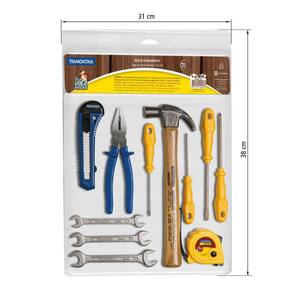 Uma vez que outra sempre precisamos de alguma ferramenta, seja uma chave ou um martelo. Com o Kit de Ferramentas Tramontina com Martelo Trena Alicate Estilete Chaves de Fenda e Chaves Fixas 11 peças você tem as peças ideais para lhe auxiliar em pequenos reparos. O kit acompanha itens que não podem faltar na sua caixa de ferramentas, oferecendo versatilidade e praticidade sempre que você precisar. Orientações Composição variada que oferece versatilidade na utilização do dia a dia.As ferramentas são produzidas e testadas conforme normas específicas. Características Gerais EAN13 7891114144062 DUN14 17891114144069 NCM 8205.40.00 Peso Líquido 1,0550 kg. Peso Bruto 1,0550 kg. Metragem 0,005301 m³. Dimensões Embalagem (Compr. X Larg. X Alt.) 380x 310x 45 mm. Observações Use óculos, luvas e outros equipamentos de proteção individual (EPIs) de acordo com a tarefa a ser executada. Mantenha ferramentas de corte longe do alcance de crianças. Mantenha as ferramentas sempre limpas para um melhor agarre, pois usá-las sujas com graxa ou óleo pode causar acidentes. Armazene em local limpo e seco.Respeite sua cidade e o meio ambiente, para descarte dos produtos e embalagens, siga as orientações de reciclagem vigentes.