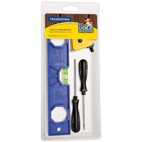 Em pequenas reformas, você tem agora, um excelente aliado: O Kit de Ferramentas Tramontina com Nível de Plástico Trena e Chaves de Fenda 4 Peças! Um kit que oferece a você ferramentas importantes, desde trena com 2 metros, chaves de fenda com ponta chata e cruzada até um nível em plástico com ampola removível. Incrivelmente útil e prático, atende a todas suas tarefas. Agora deixar aquele quadro nivelado ou montar aquelas prateleiras vai ficar muito mais fácil. Orientações Composição variada que oferece versatilidade na utilização do dia a dia.As ferramentas são produzidas e testadas conforme normas específicas. Características Gerais EAN13 7891114072709 DUN14 17891114072706 NCM 8205.40.00 Peso Líquido 0,2200 kg. Peso Bruto 0,2200 kg. Metragem 0,001007 m³. Dimensões Embalagem (Compr. X Larg. X Alt.) 305x 110x 30 mm. Observações Use óculos, luvas e outros equipamentos de proteção de acordo com a tarefa a ser executada. Mantenha ferramentas de corte longe do alcance de crianças. Mantenha as ferramentas sempre limpas para um melhor agarre, pois usá-las sujas com graxa ou óleo pode causar acidentes. Armazene em local limpo e seco.