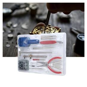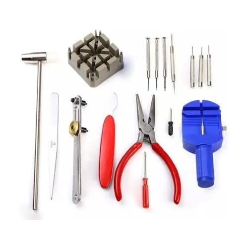 Uma caixa com abertura de três pinos (espaçamento ajustável entre pinos) .• Caixa de um pino (12 pinos no total, 4 estilos diferentes)\ n • Três furos (0,8 mm, 0,9 mm, 1,0 mm e)\ n • Três chaves de fenda (1,2 mm, 1,4 mm, 1,6 mm)\ n • Uma ferramenta de remoção Barra de mola\ n • um par de pinças\ n • um suporte de caixa\ n • um link removedor\ n\ nAs seguintes ferramentas adicionais estão incluídas:\ n • Um pequeno martelo para uso com amortecedores de pinos\ n • Removedor de relógio com uma mão\ n • Um soprador de pó de borracha\ n\ n Apresentação 100% nova em blister de plástico\ nKit\ n\ n16 Tools\ n Watchmaker