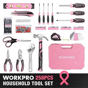 WORKPRO Caixa de ferramentas rosa, 258 peças, kit de ferramentas rosa para casa, conjunto completo de ferramentas domésticas com martelo rosa, conjunto de chave de fenda, kit de ferramentas portátil para reparo doméstico, apartamento novo, aquecimento de casa, faça você mesmo - fita rosa - De 1º de janeiro de 2025 a 31 de dezembro de 2025, sua compra deste produto resultará em uma doação mínima de $15.000 para ser doada para Helping Women Now - Capacite-se com este kit de ferramentas abrangente, projetado para homens e mulheres, com todas as ferramentas manuais essenciais para casa, para tarefas de montagem de móveis, pendurar fotos, reparos gerais... - Material de alta resistência, este kit de ferramentas é feito de aço CRV quando necessário, tratado anticorrosivo, garantindo durabilidade e resistência duradoura, o design bi-material oferece maior aderência confortável para uso prolongado - Funcionalidade aprimorada, como martelo ergonômico com aderência de absorção de choque, chaves de fenda magnéticas fortes para melhor alinhamento, fita métrica de grande largura... nosso kit de ferramentas tem o que você precisa - Armazenamento e portabilidade convenientes, ampla variedade de ferramentas são armazenadas nesta caixa de plástico durável e resistente à sujeira com compartimentos moldados que mantêm as ferramentas firmemente no lugar, com fácil acesso e proteção