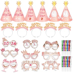 - Adereços fotográficos engraçados de Ano Novo: este conjunto de adereços de Ano Novo pode ser para reuniões de várias pessoas. Enfeite seus convidados com chapéus de cone de ouro rosa, óculos de ano novo, tiaras e barulhos coloridos para animar a celebração do ano novo, e você pode passar um feliz Ano Novo com sua família e amigos. Usar este kit de festa de Ano Novo como suporte para tirar fotos de véspera de ano novo para tirar uma selfie de ano novo e deixar memórias significativas de ano novo!