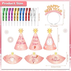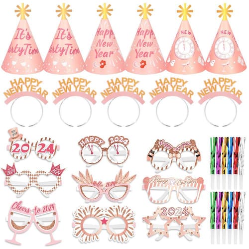 - Kit de festa de Ano Novo rosa dourado: o pacote de suprimentos para festas de feliz ano novo inclui 6 tiaras de feliz ano novo, 6 chapéus de cone de feliz ano novo, 12 peças de óculos de feliz ano novo, totalizando 51 unidades; este kit rosa de festa de ano novo com elementos brilhantes e de feliz ano novo definitivamente deixará sua festa de véspera de Ano Novo animada e feliz!