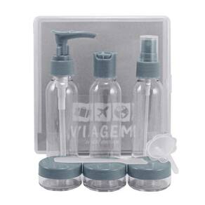 Este kit de 9 peças é ideal para transportar seus produtos de forma segura e prática durante suas viagens. Com sua embalagem impermeável, o kit não permite vazamentos, garantindo a segurança no transporte dos líquidos kit inclui: 01 Caixa Transparente 01 Frasco de Spray 60 ml 01 Frasco com Válvula Pump 60 ml 01 Frasco com Tampa Disk Top 60 ml 03 Potes 10 gramas/cada 01 Funil 01 Espátula Medidas: Comprimento: 14,5cm x Largura: 15cm x Altura: 5cm Material: Frascos: PS + Necessaire: PVC Ficha técnica - Cor: Cinza