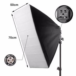 - Os difusores auxiliam a obter uma iluminação mais suave e natural, além de espalhar a luz de forma ainda mais eficiente graças ao seu tamanho (50x70 cm). Possuem bocal com rosca E27 (lâmpada comum), chaves seletoras ON/OFF e suporte com regulagem de ângulo com montagem sobre tripé de iluminação.