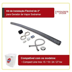 O Kit de Instalação Flexível em Aço Inox de 2" foi preparado especialmente para os geradores de vapor da Sodramar e possui todos os componentes necessários para que a instalação hidráulica do aparelho seja feita corretamente. Compatível com os modelos Compact Line Inox de 15, 18, 24 e 27 kw, é composto por 01 registro para drenagem, 01 mangote de borracha, 02 abraçadeiras, 01 mangueira flexível de 60 cm fabricada em aço inox 304 e 01 tubo flexível de aço inox com 1,25 m de comprimento e diâmetro de 2".