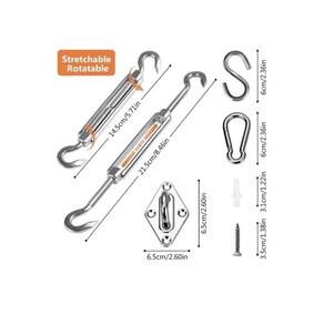 O material de todo o kit de ferramentas do dossel é feito de aço inoxidável de alta qualidade. Son resistentes a la intemperie y al óxido, y no se oxidan facilmente.Este kit Montaje Toldos Vela de jardín es ideal para la instalación de toldos triangulares, quadradas y retangulares en todas las estruturas sólidas, como concreto, ladrillos y vigas de madera.El tensor es ajustable, un dispositivo para ajustar la tensión o la longitud d de los cables, tirantes y otros sistemas de tensão, un laço metálico con una compuerta de resort, que se utiliza para conectar componentes de forma rápida e reversível. o que te facilita ajustar ou aflojar la pantalla Solar especialmente projetado para evitar que sua vela do sol seja arrastada por um vento rápido ou sacudida por condições climáticas adversas.