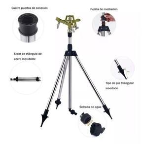 CARACTERÍSTICAS RESIDENCIAIS OU DOMÉSTICAS, LIVIANAS, DE TRANSPORTE E FACILIDADE DE MANIPULAÇÃO. -Material do aspersor: bronze\ N Material do tripé: alumínio\ N Altura do tripé: 45 a 85 centímetros (ajustável)\ N-aspersor de ângulo N\ N ajustável entre 25° e 360°\ N Botão de controle de distância 6-12,2 m de raio\ N-Área de irrigação: 113 a 467 metros quadrados - Protetor defletor, permite reduzir a cobertura. Anéis de atrito para regular o ângulo de irrigação. -Pino para círculo de irrigação total ou parcial - Inclui conector de mangueira de 1/2 polegada