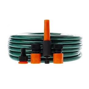 Manguera de jardín 1/2 polegada, reforzada de 15 metros + Kit de riego.El Kit de riego esta compuesto por un regulador de agua el cual se puede ajustar girando y, por lo tanto, el chorro de agua se puede ajustar según sea necesario además de sus adaptadores.La manguera es flexible y facil de enrollar.