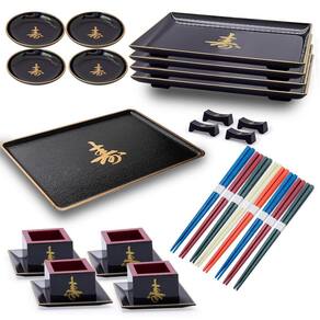 Jogo de jantar oriental com acabamento preto laqueado de excelente qualidade, alto brilho e pintura do ideograma em dourado que representa felicidade. Peças indispensáveis para amantes da culinária oriental. Cores fortes inspiradoras nas tradicionais decorações japonesas podendo auxiliar no serviço de sushis, sashimis e outras iguarias. Cuidados: - Lavar com água morna e sabão neutro utilizando esponja macia, seguido de pano seco. - Não utilizar produtos químicos ou abrasivos na limpeza. - Não vai à lava-louças.