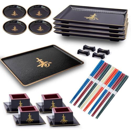 - 4 x Unidades de Molheiras - 4 x Unidades de Descanso para Hashi - 4 x Unidades de Copo para saque - 4 x Unidades de Prato para Saque - 4 x Unidades de Hashi - 4 x Prato Retangular - 1 x Bandeja tray