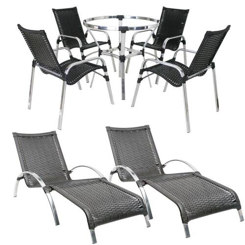 ITENS INCLUSOS:04 Cadeira Emily em Alumínio 01 Mesa Emily (não acompanha vidro) 02 Espreguiçadeiras Emily CARACTERÍSTICAS:- Peças produzidas em alumínio polido e revestidas em fibra sintética com proteção UV.- Nossos produtos são artesanais e podem ocorrer variações na medida de até 2cm.- As cores dos produtos podem variar de acordo com o ambiente e com a iluminação em que as fotos foram tiradas.Ideal para ambientes Internos, varandas, edículas, área de lazer, salas de estar, sala de jogos, churrasqueiras, sala de filme, recepção, sala de espera entre outros.ESPECIFICAÇÕES TÉCNICAS:Cadeira Emily:- Altura total: 84 cm- Altura assento ao chão: 39 cm- Largura: 55 cm- Profundidade: 63 cm- Suporta até 160 kgMesa Emily: - Altura: 60 cm- Diâmetro: 60 cm- Não acompanha o tampo Espreguiçadeira Emily:- Altura total: 72 cm- Altura do assento ao chão: 27 cm- Largura: 66 cm- Profundidade: 162 cm- Suporta até 170 kg - Sem regulagem DÚVIDAS FREQUENTES:- QUAIS AS CORES DISPONÍVEIS?Temos 11 opções de cores disponíveis para a fibra sintética.- COMO ESCOLHER A COR DO PRODUTO?Após a confirmação do pagamento ficará disponível um campo de mensagens entre o vendedor e o comprador, por lá será acertado todos os detalhes referentes as cores do produto escolhido antes de ser encaminhado para a produção.- OS PRODUTOS PODEM FICAR EXPOSTOS AO TEMPO?Sim, a estrutura de alumínio pode ser molhada e utilizada em áreas abertas, exposta ao sol e chuva. A fibra sintética possui filtro UV, com isso o produto pode ficar tranquilamente exposto ao tempo sem que o mesmo danifique-o.